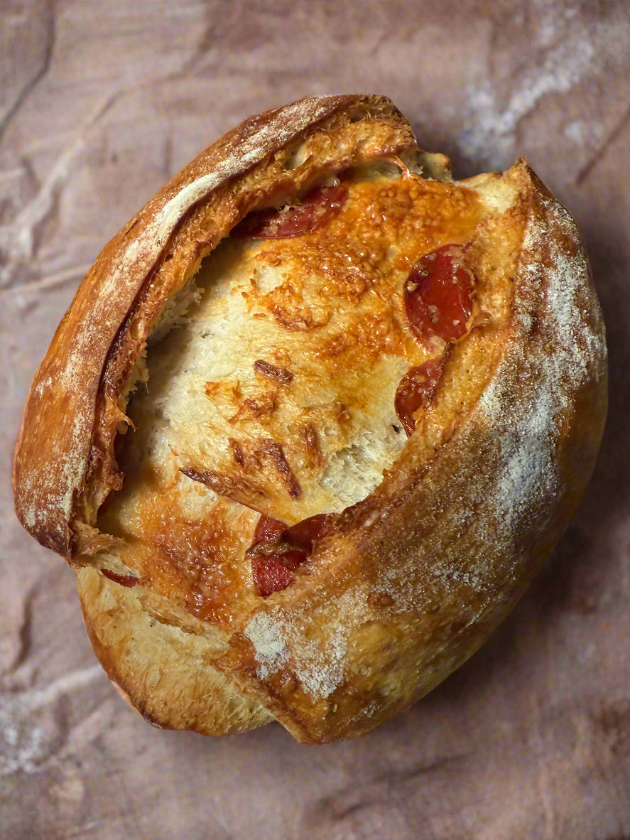 This exquisite sourdough bread is infused with classic pizza herbs and spices, and filled with pepperoni and pockets of cheese for a truly indulgent experience. A delightful, one-of-a-kind loaf that perfectly complements any weeknight meal.